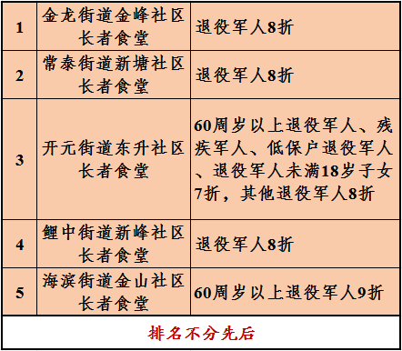 “我们平时和子女们分开居住的,因为家离这里比较近,而且这里的饭菜又干净、卫生,所以我和老伴中午经常过来吃饭,凭退役军人证又可以享受打折的优惠待遇,真的是划算又暖心。”对于长者食堂,家住新峰社区的退役老兵王老伯忍不住连连称赞。 从饮食、住宿到消费、养老,近年来,鲤城区社会化拥军涵盖的方向越加丰富,越来越多的社会力量参与到退役军人关爱事业中,让他们感受到社会的关怀和温暖,社会化拥军氛围不断浓厚,真正让退役军人成为全社会尊重的人,让军人成为社会尊崇的职业。 5家“长者食堂”名单