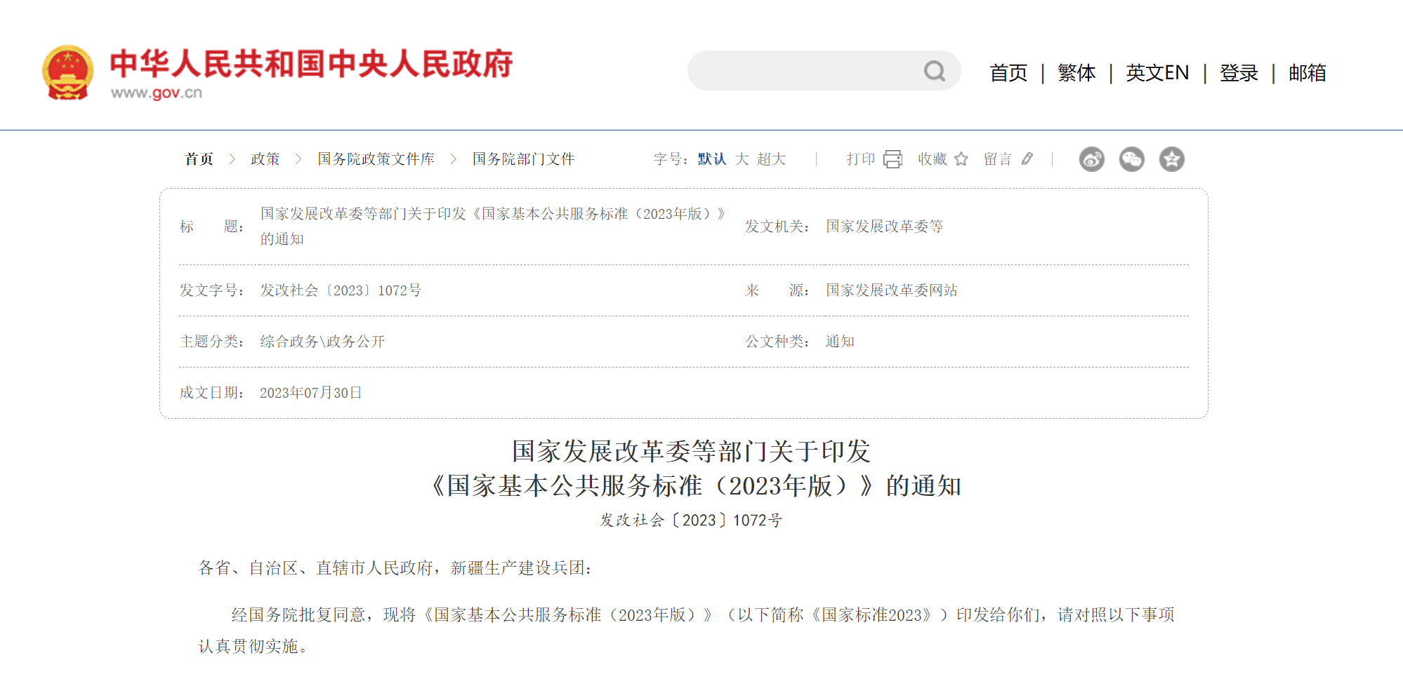 前不久,经国务院批复同意,国家发展改革委、教育部、民政部、财政部、人力资源社会保障部、住房城乡建设部、文化和旅游部、国家卫生健康委、退役军人事务部、体育总局,联合印发了《国家基本公共服务标准(2023年版)》的通知 ,要求各地认真贯彻实施。