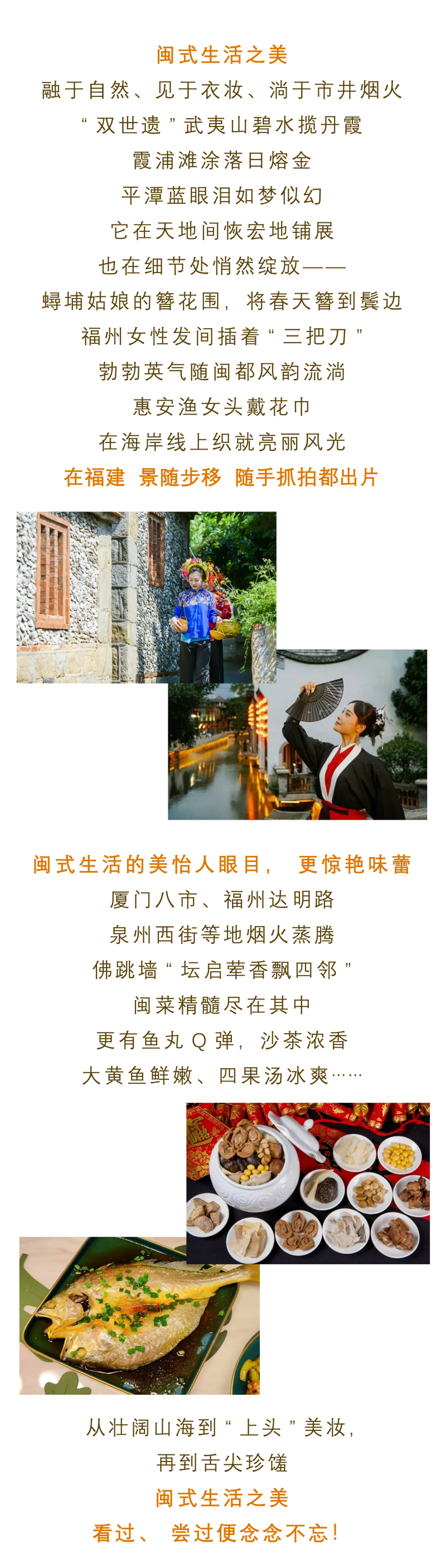 这里没有单调的日复一日 有的是看不够的风景、听不完的传奇 和浓得化不开的幸福烟火气 闽式生活,每一面都“超带感” 值得您亲自领略这片有福之地的别样风情!