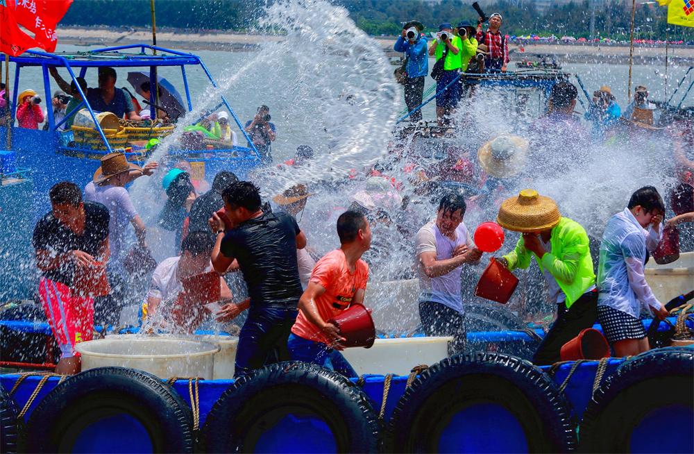 福建省石狮市蚶江镇海上泼水活动,是闽南独特的端午活动,也是全国乃至全世界独有的海上泼水活动。蚶江海上泼水节历史悠久,至今已传承近300年,成为了一种别具特色的闽台对渡文化习俗。每逢端午,两岸船只齐聚海上,以泼水互祝平安、传递情谊,逐渐演变为独具海洋文化特色的民俗盛会。闽台对渡承载着两岸共同的历史记忆,孕育了独特的通商文化和海上泼水习俗,见证了两岸交流的悠久传统。