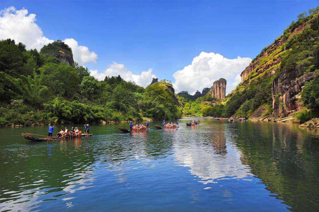 六曲是武夷山九曲溪流转折处最为开阔明朗的一段。行至六曲,溪流呈大回旋之势,成180度弯曲而进。此处是观赏武夷山核心,天游峰雄姿的最佳地点之抬头仰望,但见天游峰巍然耸立于溪南,峰顶的亭阁与蜿蜒的登山步道清晰可见,犹如一幅立体的山水画屏。峰下环绕的碧水,便是著名的“晒布岩”倒影之处。 六曲岩壁上,“空谷传声”等历代摩崖石刻点缀其间,赋予自然奇观以人文的厚度。舟筏在此常稍作停留,让游人静静品味这山水交响的高潮篇章:前有仙掌峰之奇绝,侧有天游峰之雄伟,清溪环绕,丹霞映波,集中展现了武夷“碧水丹山”的魂魄。