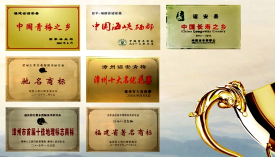诏安县政府较重视青梅品牌的建设和宣传,早在2000年,诏安县红星乡青梅技术研究会就制定了国内首个《诏安红星青梅》鲜果和干湿梅省级地方质量标准。 2001年,诏安县被国家林业局授予“中国青梅之乡”的称号;2005年,诏安县红星农场向中国绿色食品发展中心申报了5000亩青梅绿色食品认证;2009年,“诏安青梅”被漳州市人民政府授予“漳州市十大名优花果”称号; 2013年诏安县被中国营养协会授予“中国海峡硒都”称号;2014年,“诏安红星青梅及图”荣获了国家工商局授予的“中国驰名商标”和“中国地理标志”(29类鲜果类产品)的双认证;2015年,诏安县红星青梅被市工商局授予“漳州市首届十佳地理标志商标”。 一系列的品牌创建提高了诏安青梅的知名度,为以后诏安青梅产业的发展奠定了良好的基础。 |